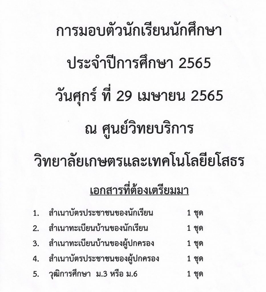 กำหนดการมอบตัวนักเรียนนักศึกษา ปีการศึกษา 2565 Posted on เมษายน 21, 2022เมษายน 21, 2022 by admin_web Posted in ไม่มีหมวดหมู่.