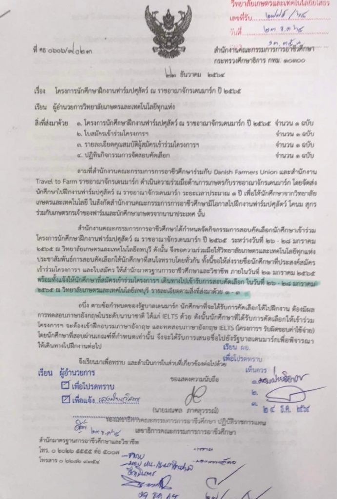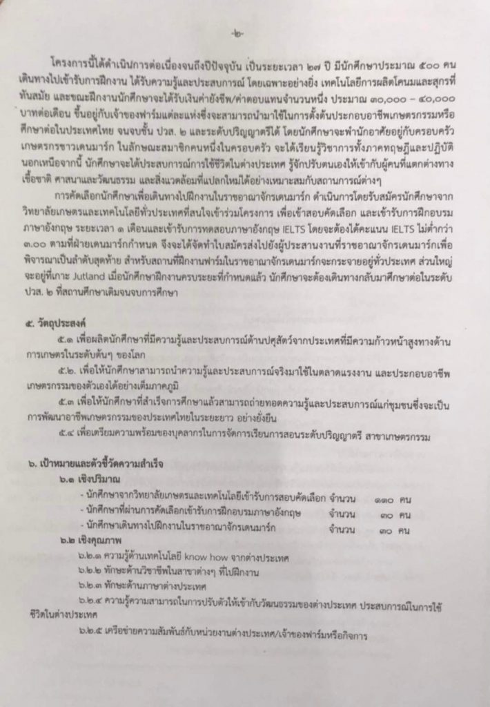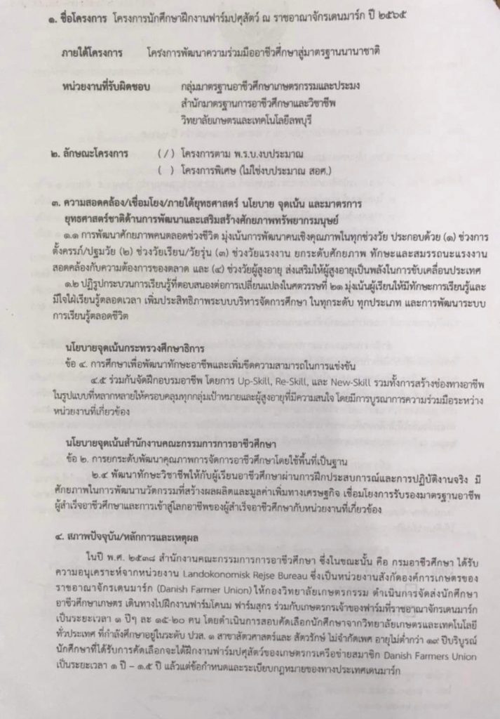 โครงการนักศึกษาฝึกงาน ณ ราชอาณาจักรเดนมาร์ก ประจำปี 2565 Posted on มิถุนายน 29, 2022มิถุนายน 29, 2022 by admin_web “สำนักงานคณะกรรมการการอาชีวศึกษาร่วมกับ Danish Farmers Union และสำนักงาน Travel to farm ราชอาณาจักรเดนมาร์กดำเนินความร่วมมือด้านการเกษตรกับราชอาณาจักรเดนมาร์กโดยจัดส่งนักศึกษาไปฝึกงานฟาร์มปศุสัตว์ ณ ราชอาณาจักรเดนมาร์กระยะเวลา 1 ปี เพื่อให้นักศึกษาจากวิทยาลัยเกษตรและเทคโนโลยีในสังกัดสำนักงานคณะกรรมการการอาชีวศึกษามีโอกาสไปฝึกงานฟาร์มปศุสัตว์โคนมและฟาร์มสุกรร่วมกับเกษตรกรเจ้าของฟาร์มและนักศึกษาเกษตรจากนานาประเทศ” Posted in ไม่มีหมวดหมู่.